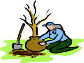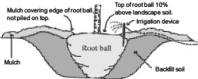 5. Remove all containers from the root ball. Cut away plastic and peat pots; roll burlap and wire baskets back into the hole, cutting as much of the excess cut away as possible. If you can remove the wire basket without disturbing the root ball, do it. If roots have been circling around in the container, cut them and spread them out so they do not continue growing this way inside the hole and become girdling roots later in the life of the tree. 6. Backfill the hole with the same soil that was removed. Amendments such as peat moss likely do more harm than good. Make sure the soil that goes back is loosened - no clods or clumps. Add water as you fill to insure good root to soil contact and prevent air pockets. There is no need to fertilize at planting. 7. Don't cut back the branches of a tree after planting except those that are rubbing or damaged. The leaf buds release a hormone that encourages root growth. If the tree is cut back, the reduced number of leaf buds results in less hormone released and therefore fewer roots being formed. 8. Water the tree thoroughly and then once a week for the first season if there is insufficient rainfall. 9. Mulch around the tree. THIS IS IMPORTANT! Mulch should be 2 to 4 inches deep and cover an area two to three times the diameter of the root ball. Mulching reduces competition from other plants, conserves moisture and keeps soil temperature closer to what the plants' roots prefer. 10. Stake only when necessary. Trees will establish more quickly and grow faster if they are not staked. However, larger trees or those in windy locations may need to be staked the first year. Movement is necessary for the trunk to become strong. Staking should be designed to limit movement of the root ball rather than immobilize the trunk.