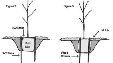 In Figure 2 above, one horizontal two-by-two is screwed or nailed to two vertical two-by-twos that have been placed against the side of the root ball and driven through the planting hole into the native undisturbed soil. A second set is used on the other side if needed for larger trees. In Figure 3 above, two or three wood dowels are driven through the edge of the root ball. These do not have to be removed because they simply rot in place. There is no danger of this system girdling the trunk since nothing is attached to the trunk. Both of these inexpensive alternate systems eliminate the requirement to return to the tree to remove the staking system because they simply decay in a few years. Source: Kansas State University Research & Extension (Line drawings and explanation, courtesy of Ed Gilman, Ph.D., Professor of Environmental Horticulture, University of Florida) |