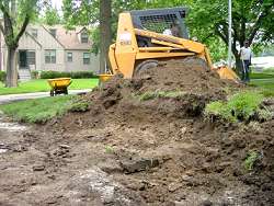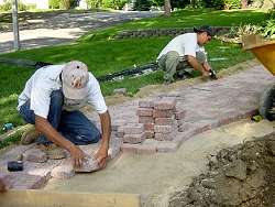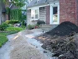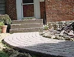 Once the ground was appropriately graded work began on the new walkway. Choices for walkway material are limited only by imagination. Consideration was given to concrete, loose stone and flagstone but in the end we chose Pavestone Plaza tumbled pavers. This brick-like material is extremely durable, attractive and a very good value. Our brick chimney is a very prominent part of our landscape and we wanted to make sure the walkway and chimney suited each other. This was somewhat challenging as the old bricks of the chimney are not uniform in color and of course are attractively weather-worn. The availability of so many Pavestone colors made it much easier to create a suitable color pattern. Tumbled pavers (kind of like stone-washed jeans) provided that all important instant lived-in look.