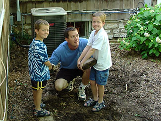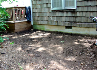 So, Let's get to work! First things first. The existing area needed to be cleared and readied for the start of the project. We agreed to do this part ourselves. Mulch and leaves were raked away and the existing patio was removed. Kevin even got a little help from the boys.
